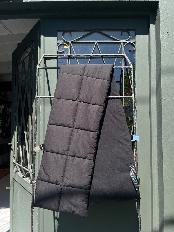 bufanda puffer negra, con broche frontal y bolsillo interno